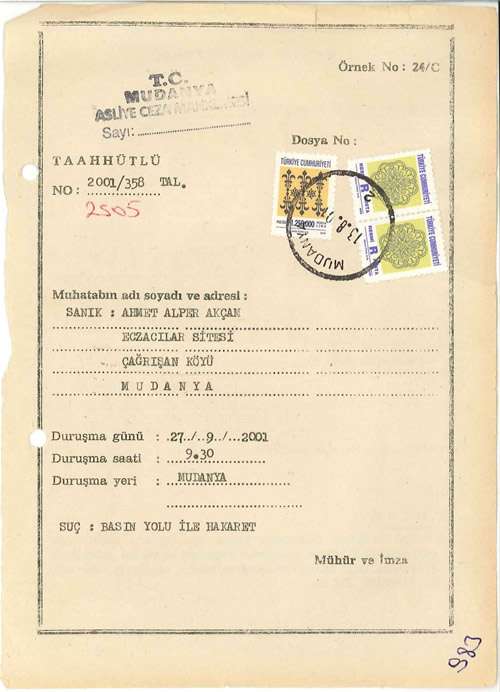 Alper Akçam tarafından Masalsı adlı romanda konu edilmiş olaylar mahkemeye de yansıyacak, Ahmet Acar’ın savcılığa yaptığı “suç duyurusu” ile zamanın 301’i olan 169. maddeden yargılanmasını istediği Alper, “basın yoluyla hakaret”ten iki yıla yakın yargılanacaktır. Sonrasında ise Ankara Hukuk Fakültesi’nden Prof. Dr. Nevzat Toroslu’nun örnek bilirkişi raporu ile aklanma…